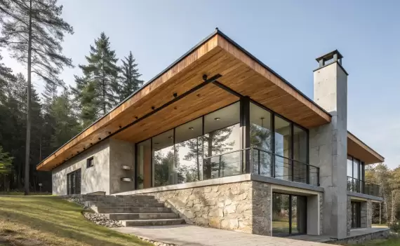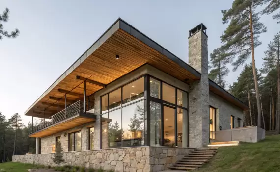 Двухэтажный дом с безрамным остеклением и теплыми стеклопакетами